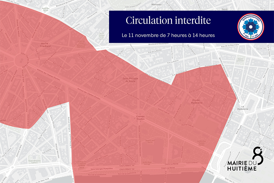 La circulation est interdite le 11 novembre de 7h à 14h dans le périmètre formé par les voies suivantes qui restent, sauf mention contraire, ouvertes à la circulation :