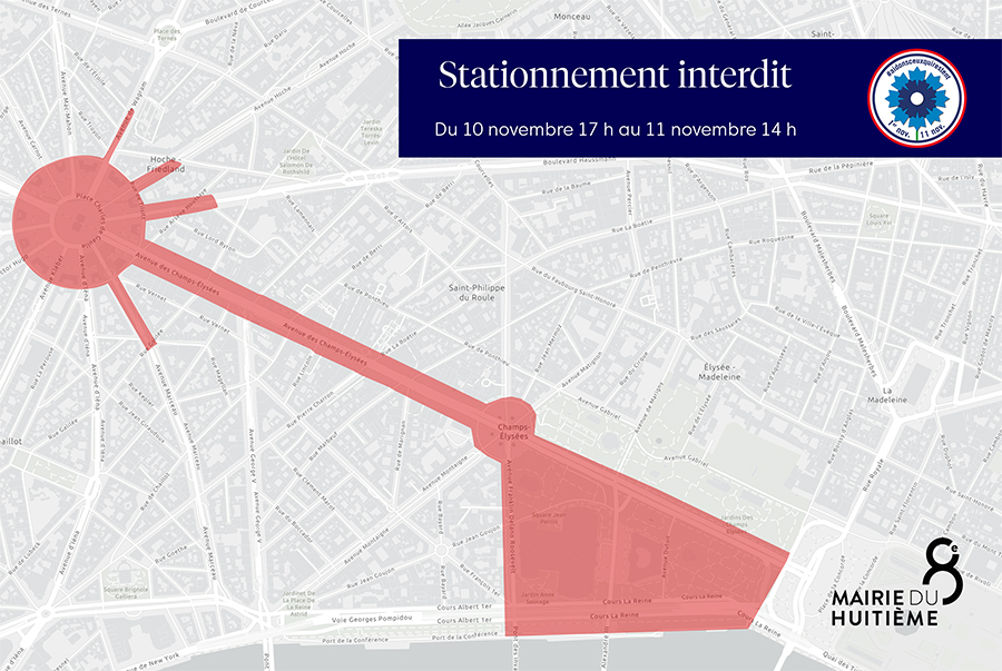 En raison de la cérémonie nationale commémorant le 107e anniversaire de l'Armistice du 11 novembre 1918 , la Préfecture de Police a pris des mesures de restriction du stationnement, de la circulation et pour la protection des personnes.